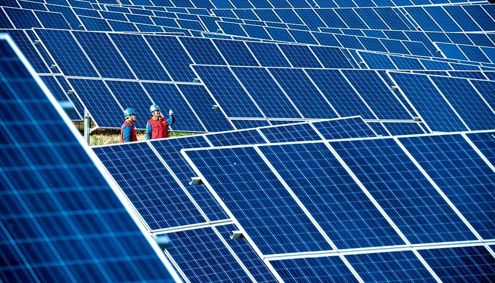▲ 4月28日,國(guó)網(wǎng)山東淄博供電公司技術(shù)人員巡檢光伏電站。遠(yuǎn)德亮攝